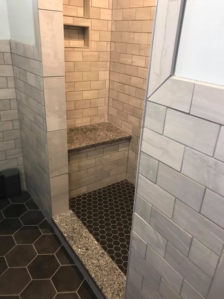 Beautiful custom shower tiled in shades of grey and black