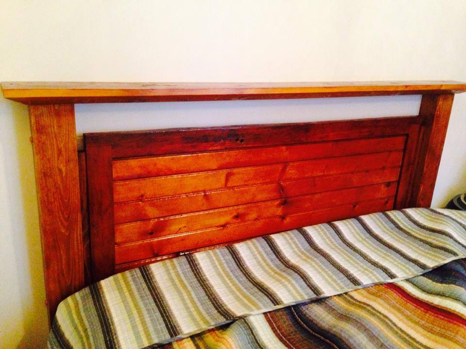 Custom headboard built with reclaimed lumber from demolished camp