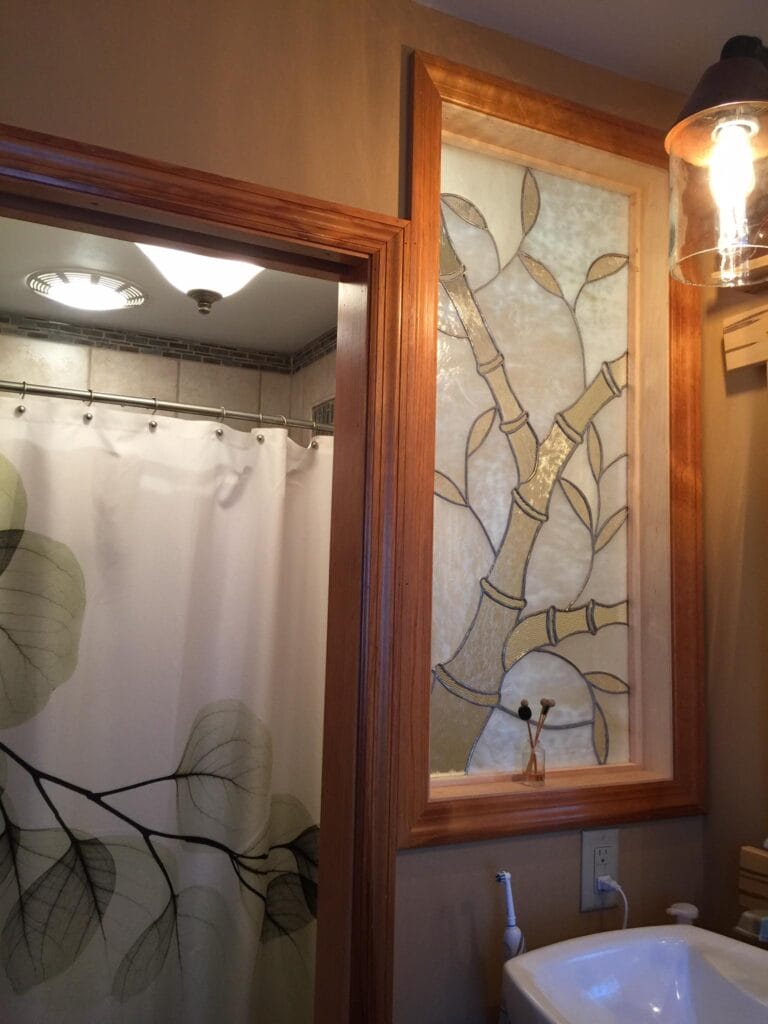 A completely original stained glass window built to allow for privacy and natural light