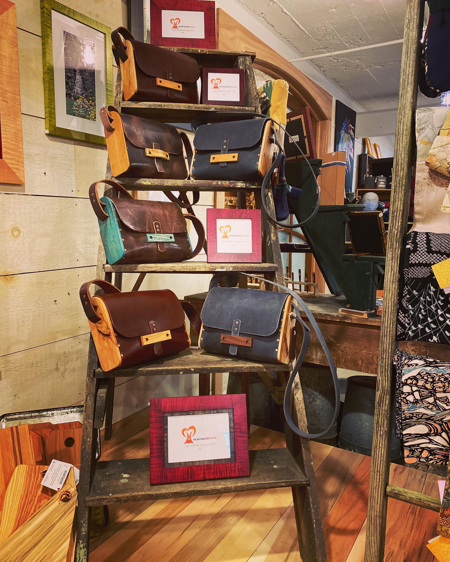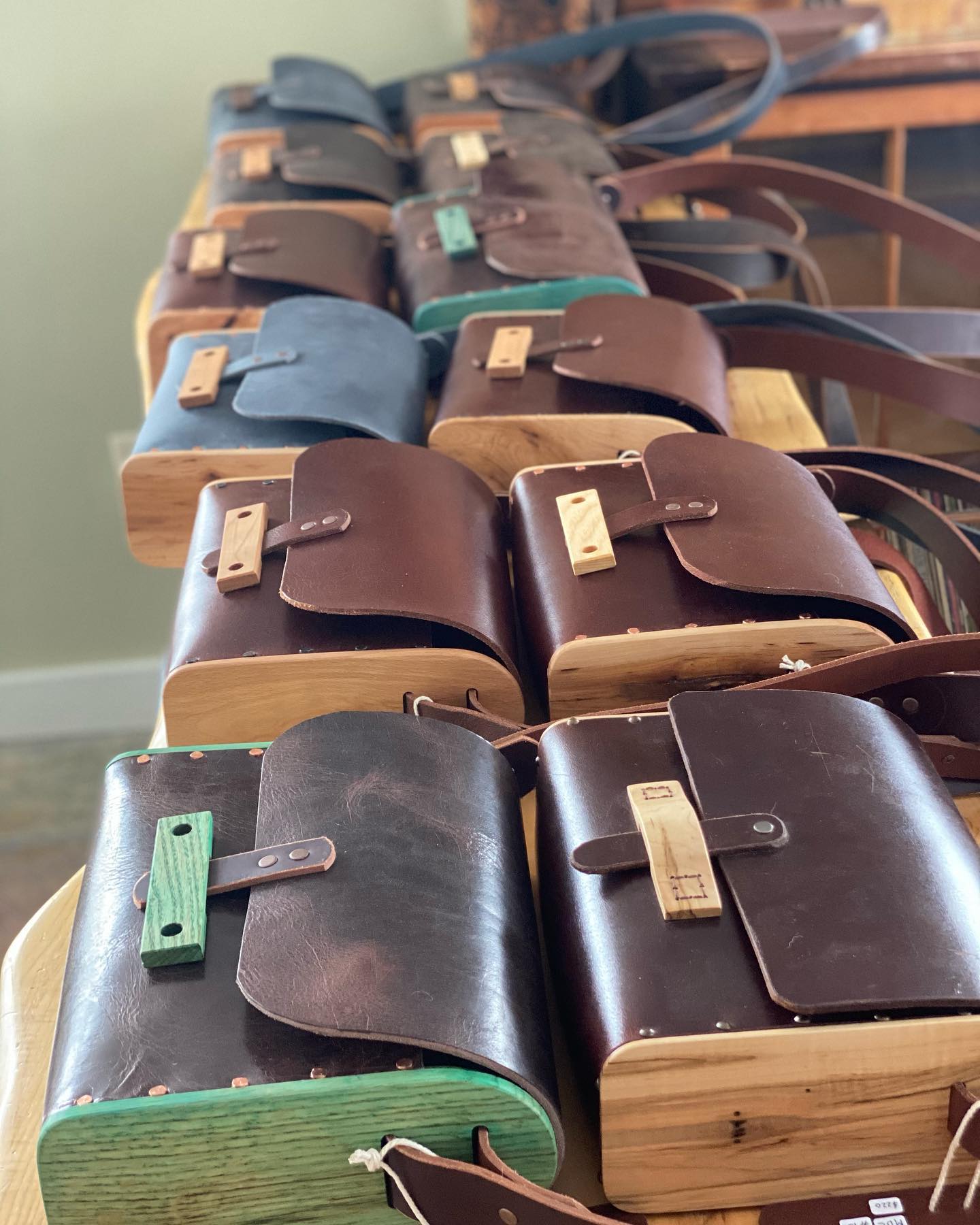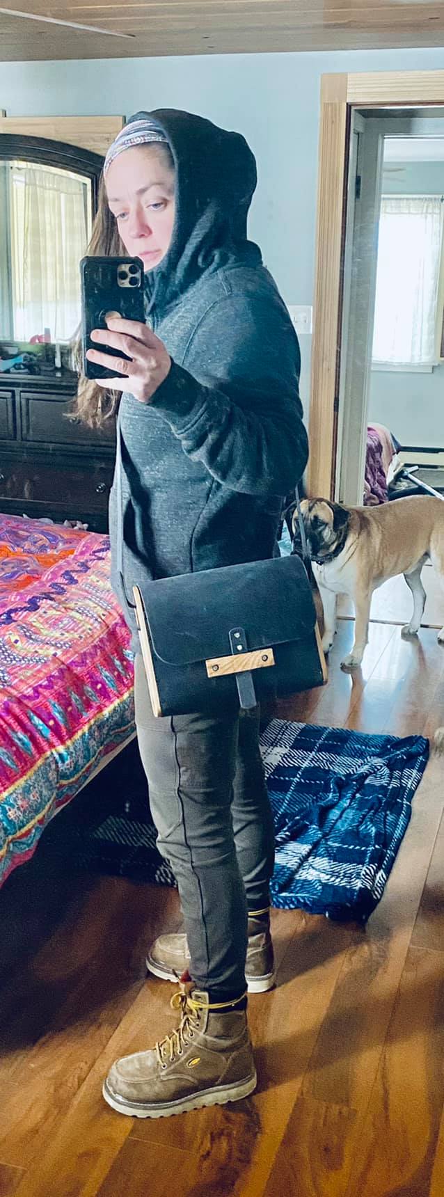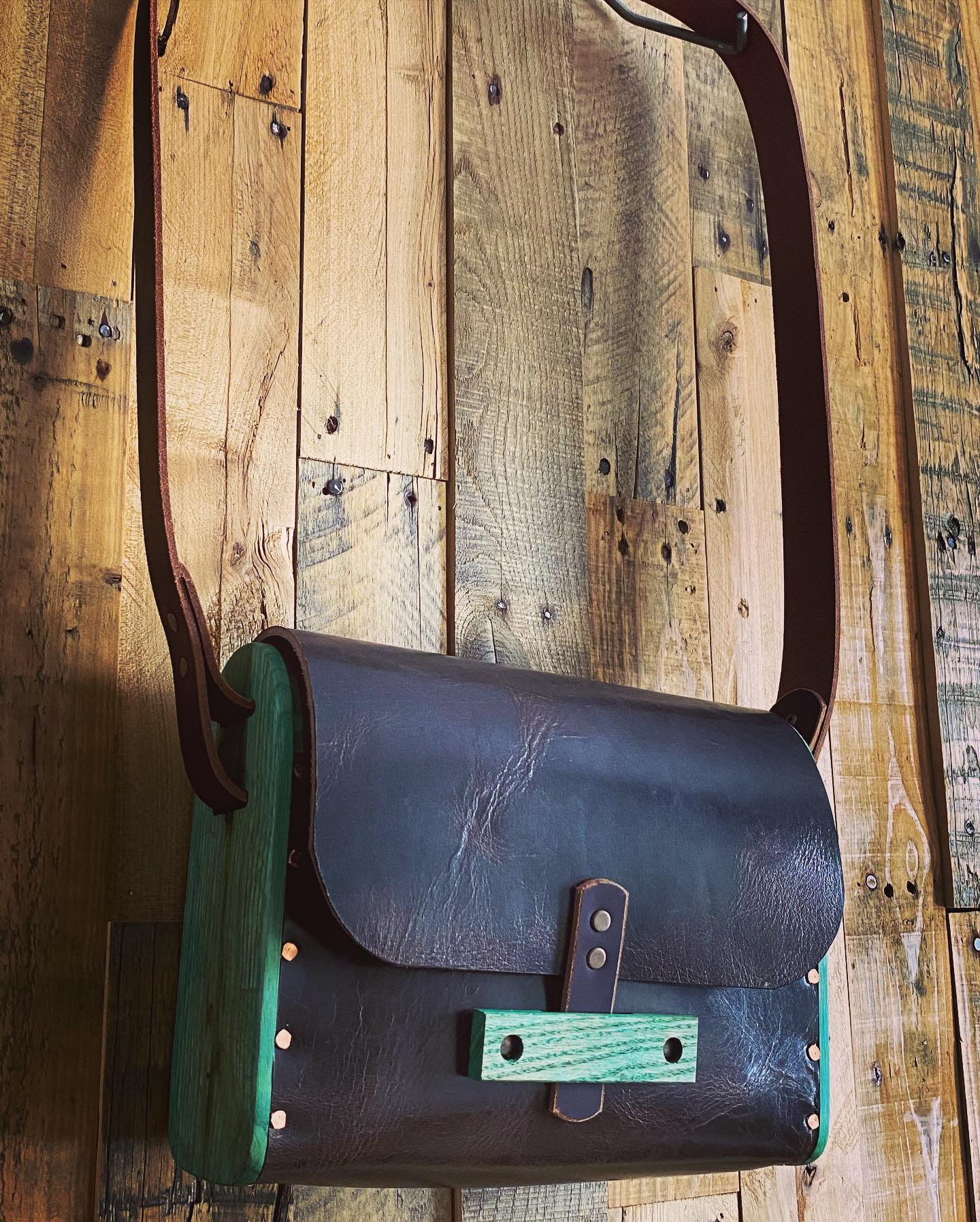 This cross body bag sports earthy-toned colored genuine leather paired with stained solid wood sides accented with brass rivets for a modern yet rustic down to Earth style. Handmade by Angelina and Brandon, each bag is one-of-a-kind and colors may differ slightly from the product images.