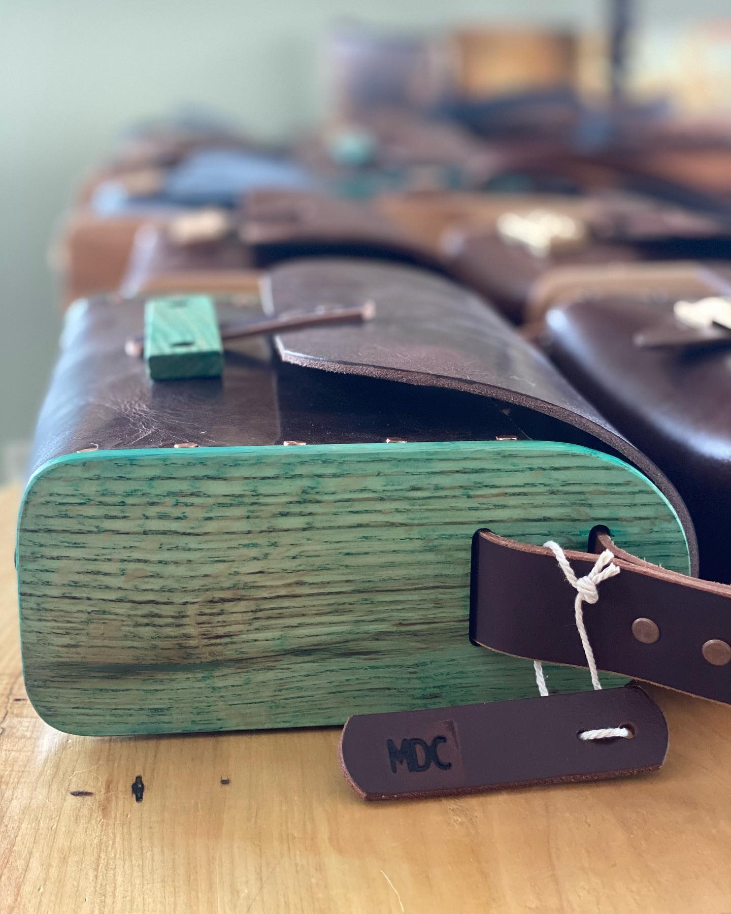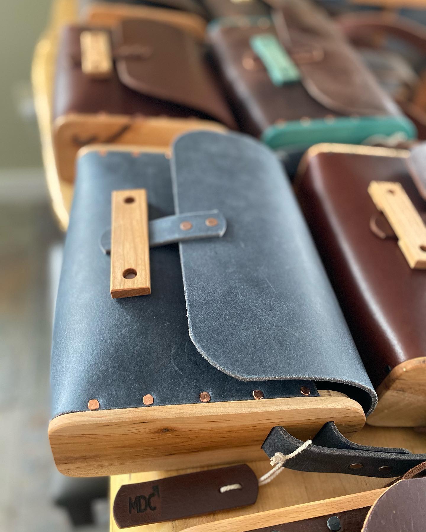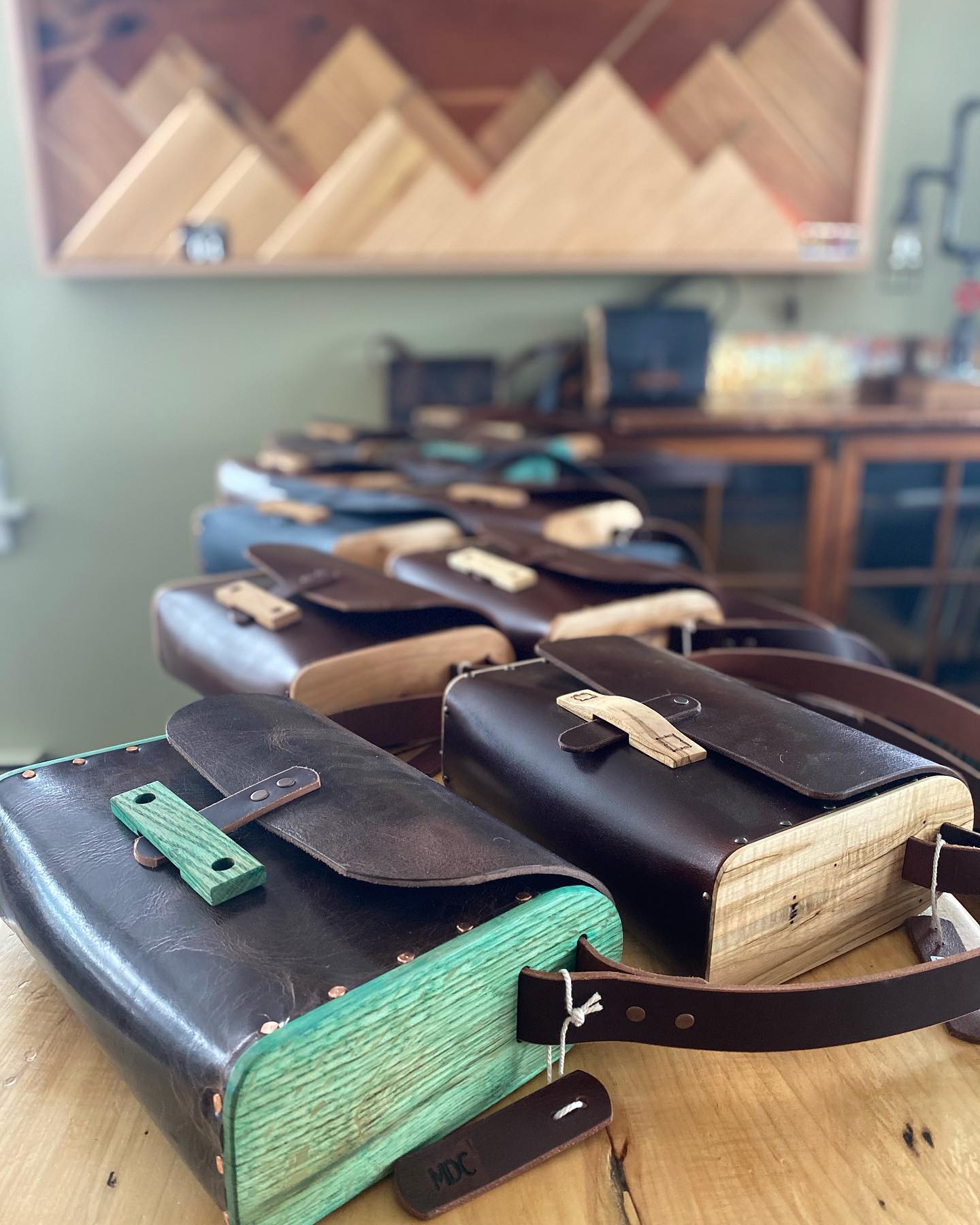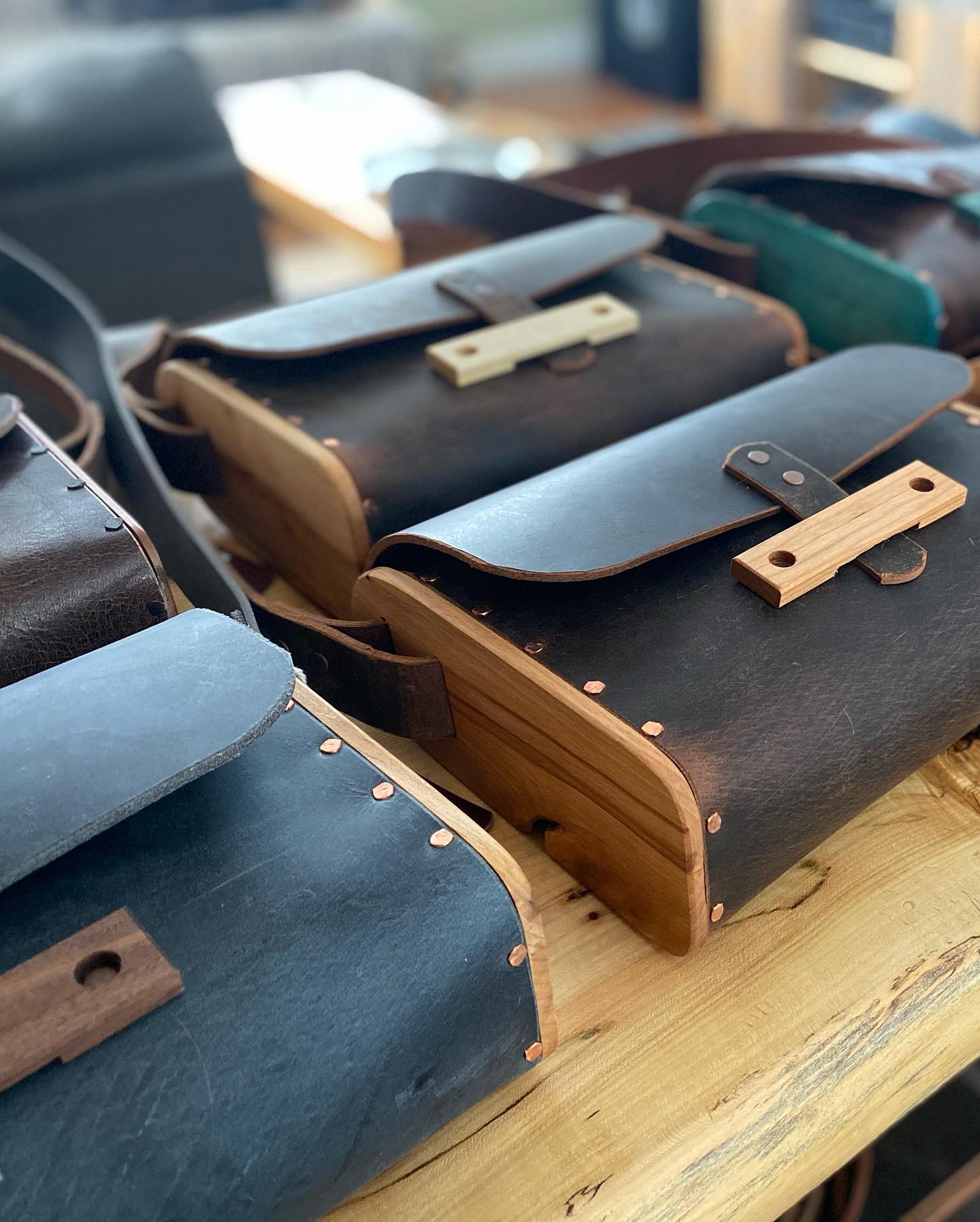 This cross body bag sports earthy-toned colored genuine leather paired with stained solid wood sides accented with brass rivets for a modern yet rustic down to Earth style. Handmade by Angelina and Brandon, each bag is one-of-a-kind and colors may differ slightly from the product images.
